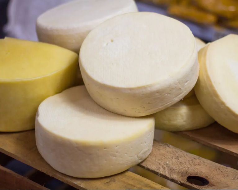 Ingredientes: Queijo, para ser Canastra, só leva leite cru, coalho, pingo (soro residual do processo de secagem de levas anteriores do queijo) e sal.